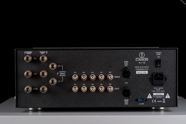 The advantages of having an accurate volume attenuator have been used for designing a special C-link bus line for a synchronous volume control of two AI1.10 amplifiers. This technological tweak enables to use two amplifiers in a monoblock mode without a need to use an extra preamplifier. In this monoblock mode two amplifiers gets connected to each other via C-link bus line using a special cable- then one of the amplifiers becomes a master and the other one a slave and all the information is being transmitted synchronously, either volume control command or input selection of a slave amplifier. This mode enables to select two XLR inputs.