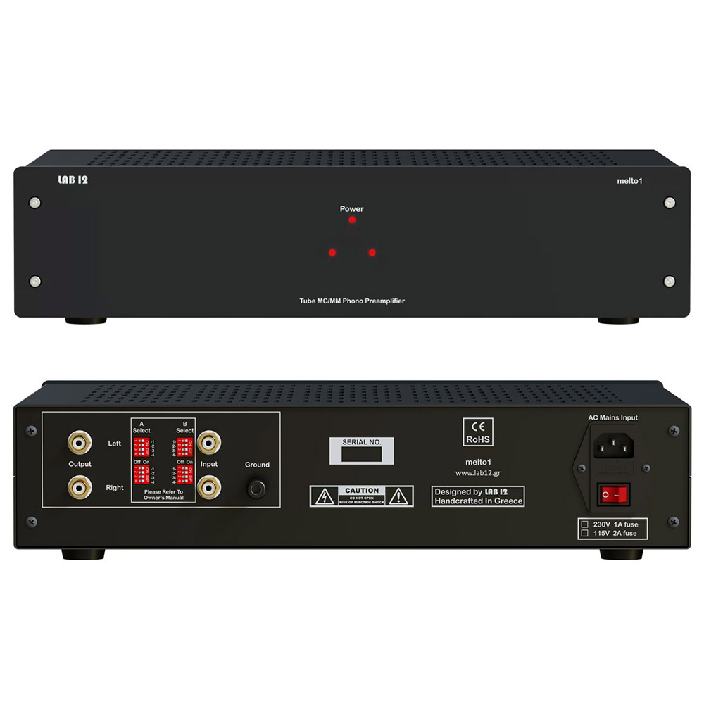 קדם מגבר לפטיפון מנורות LAB 12 – Melto 1 , מדובר בפונו סטייג הי אנד MM/MC הבנוי עם 4 מנורות וביצועים ברמה הגבוהה ביותר עם אפשרויות כיוונון Cartridge type, Gain, Impedance, Capacitance, Curve, המצויים בגב המכשיר . מדובר מכשיר חלומי לכל אודיופיל ביחס למחירו עם VFM מדהים . גימורים לבחירה , שחור מט.